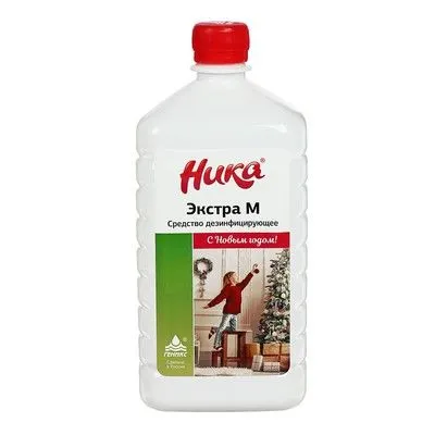 Дезинфицирующее средство «Ника‑Экстра М» 1 л  — концентрированное дезинфицирующее и моющее средство без хлора для обработки поверхностей, посуды, белья, предметов ухода за больными и предстерилизационной очистки изделий медназначения.
