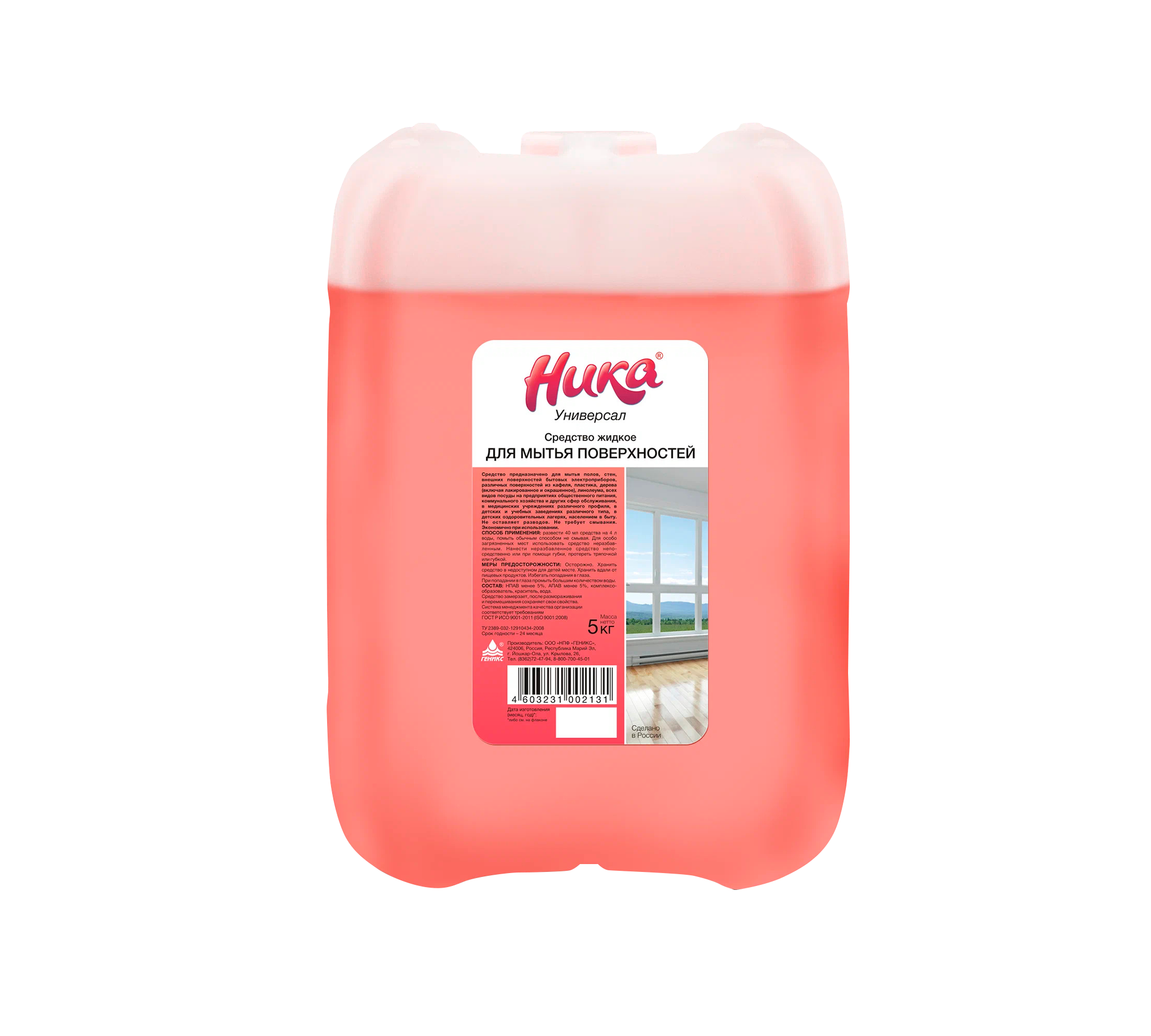 Моющее средство «Ника Универсал» 5 кг — концентрированное жидкое универсальное средство для мытья полов, стен и поверхностей в доме и организациях. Оно эффективно удаляет жир, грязь, пыль, сажу и налёт с кафеля, пластика, дерева, линолеума, не оставляя разводов, и работает в воде любой жёсткости и температуры. Перед применением продукт следует растворить в воде.
