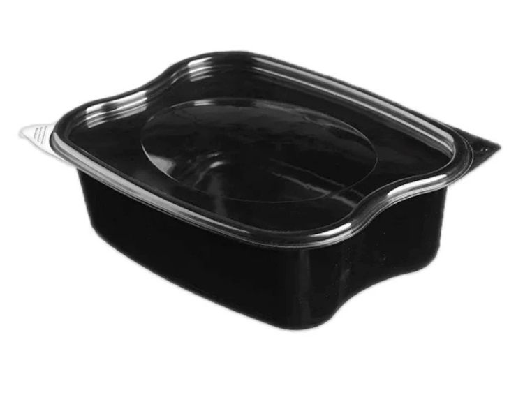 Пластиковый двухсекционный одноразовый контейнер с крышкой для фасовки продуктов быстрого питания.