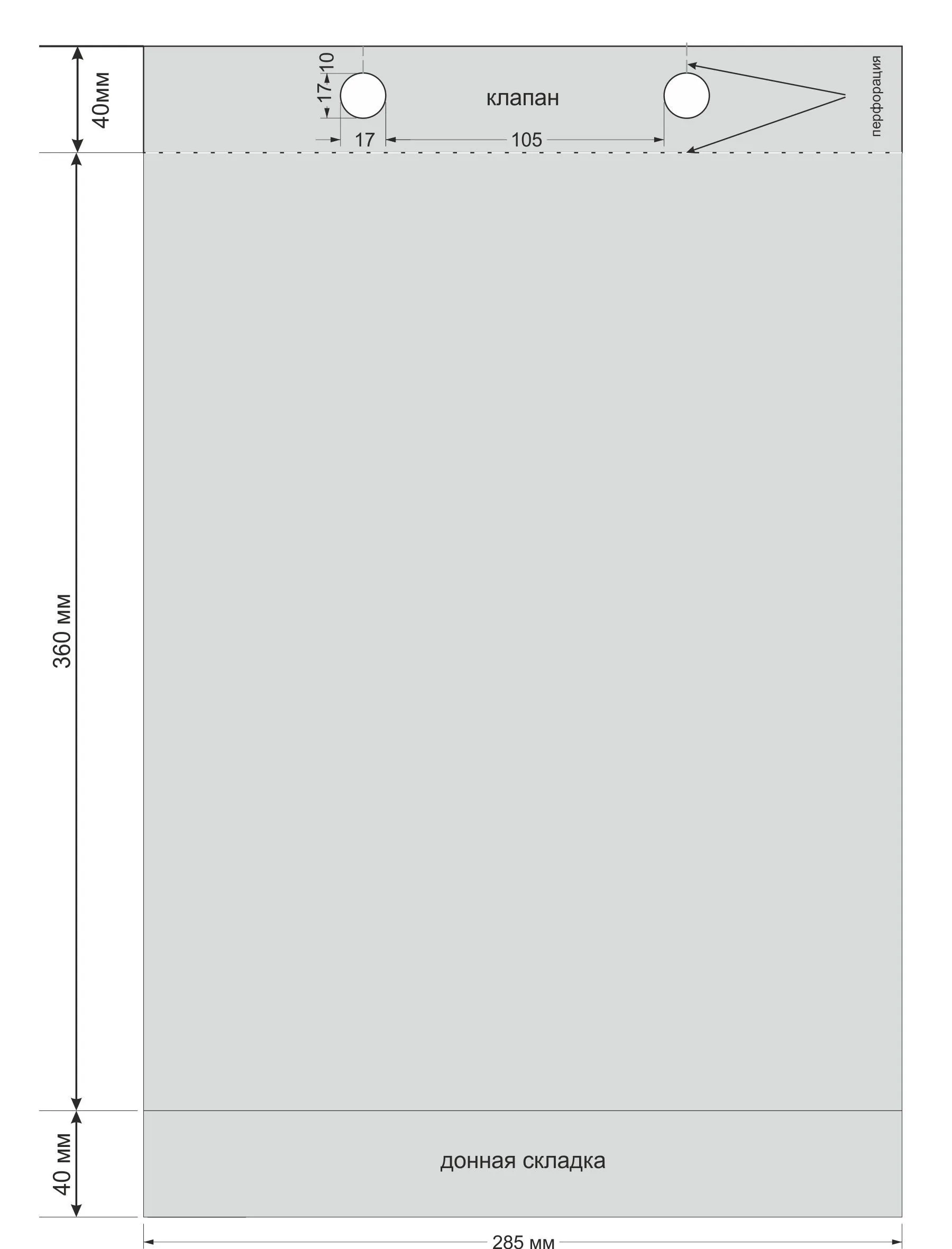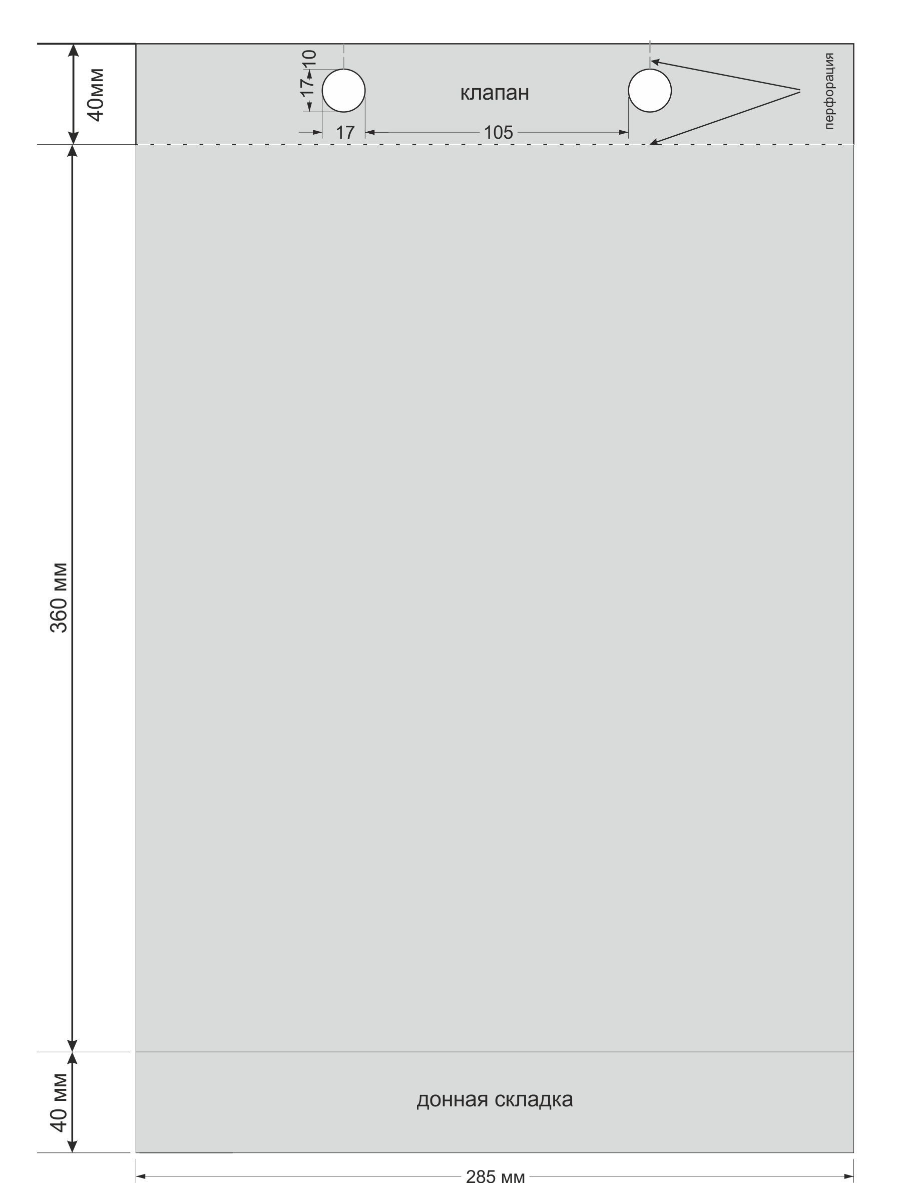 Размер пакета: 285х360+40 мм (ширина х длина + донная складка).
